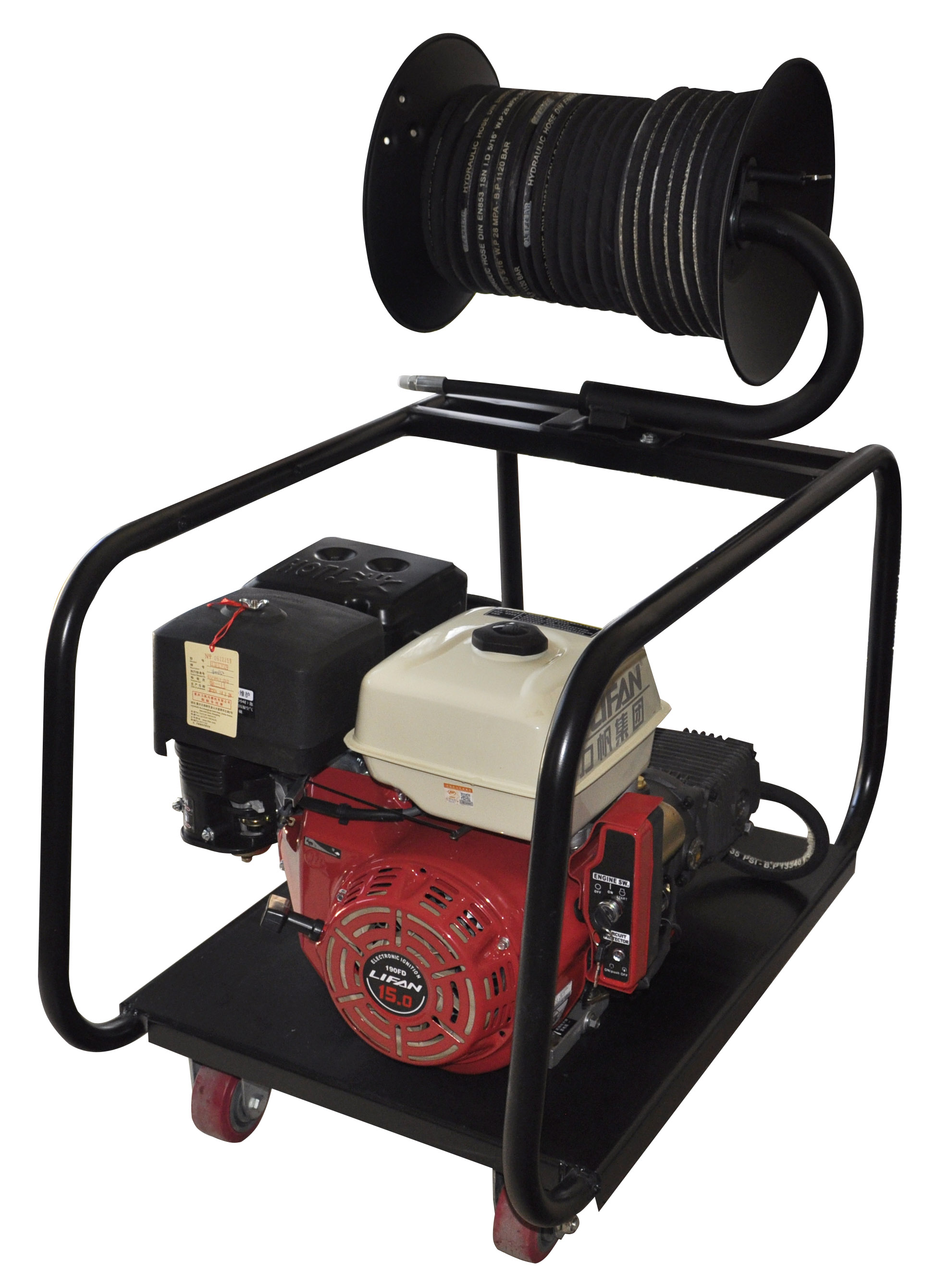 高壓管道疏通機具有巨大的能量噴射出的高壓水射流完全能夠破壞堅硬結(jié)垢物和堵塞物,但對金屬卻沒有任何破壞作用。同時又由于高壓水的壓力小于金屬或鋼筋混凝土的抗壓強度,故對清洗對象沒有任何破壞作用。應(yīng)用于疏通、清除管道中的堵淤和污物。它以汽油機、柴油機或電機為動力驅(qū)動高壓泵運轉(zhuǎn),利用高壓水射流在噴頭上產(chǎn)生的推進力自動前行。當噴頭到達管端時,高壓水后作用力清掃管壁并將雜物沖出管外,以達到清洗管道的目的。
