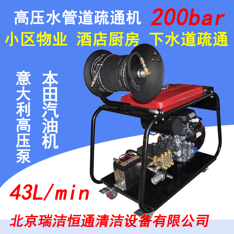 一般物業(yè)公司和疏通公司大多采購500型的高壓疏通機,這款機器適用性比較廣,RJHT-500型電機驅(qū)動的是9KW,壓力150bar,流量35L/min;汽油機驅(qū)動的壓力可達200bar,流量43L/min,200bar工作壓力滿足管道疏通需求,41L/min大流量更讓疏通變得如此簡單,高效且效率,意大利進口高壓泵結(jié)合原裝本田汽油機HONDA GX 630 特別加裝電啟動裝置 配備免維護電瓶。高壓水疏通機疏通下水管道時,并不是壓力越大越好,這里不像高壓清洗機用做除漆除銹去結(jié)皮等,需要的壓力要大得多。其實疏通管道不需要太大的壓力,150公斤到200公斤,完全夠用,壓力一定的情況下,水流量越大的疏通機,疏通效果越好,根據(jù)我們的實際應(yīng)用得到的結(jié)論是:壓力150bar,流量54L/min的高壓水疏通機,比壓力200bar,流量43L/min的高壓疏通機勁兒要大,疏通效果更好。